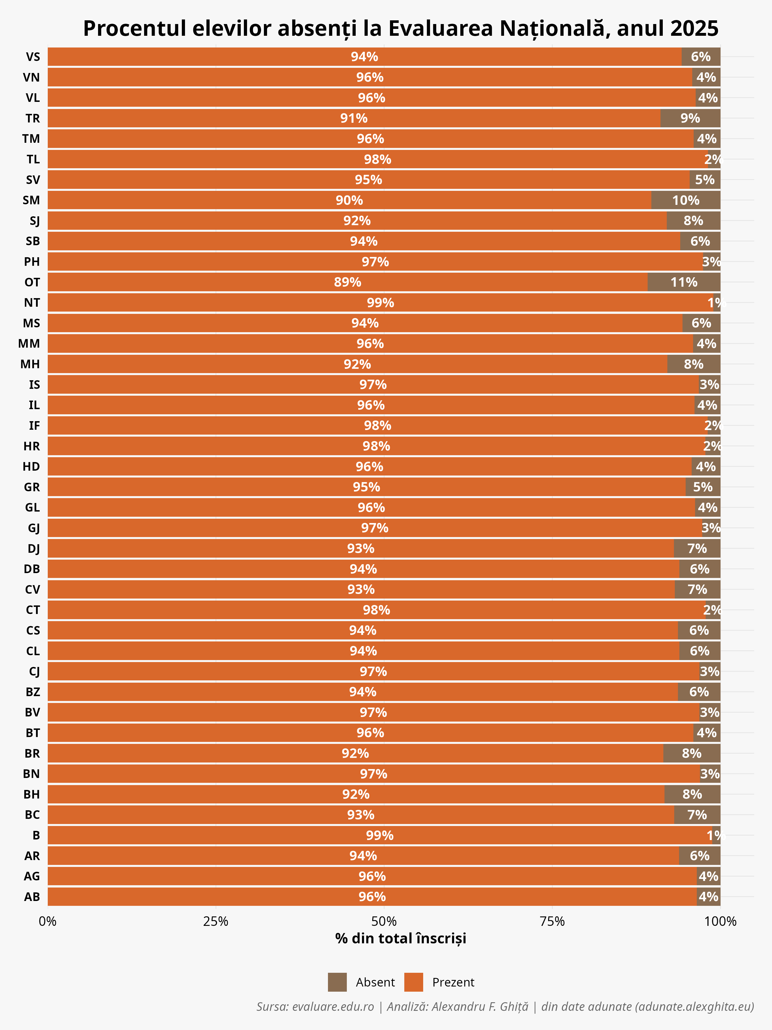 Absența nu e întâmplătoare, e structurală. În ciuda mediei naționale bune la prezență, există județe precum Olt, Teleorman sau Satu Mare unde absenteismul e și peste 9–11%. Și nu e răspândit aleatoriu: jumătate din absenți provin doar din 13 județe, iar aproape trei sferturi vin din rural. Acolo, Evaluarea Națională e o barieră uriașă pentru copiii care nu au profesori, bani de transport sau, pur și simplu, nu mai văd rostul examenului.