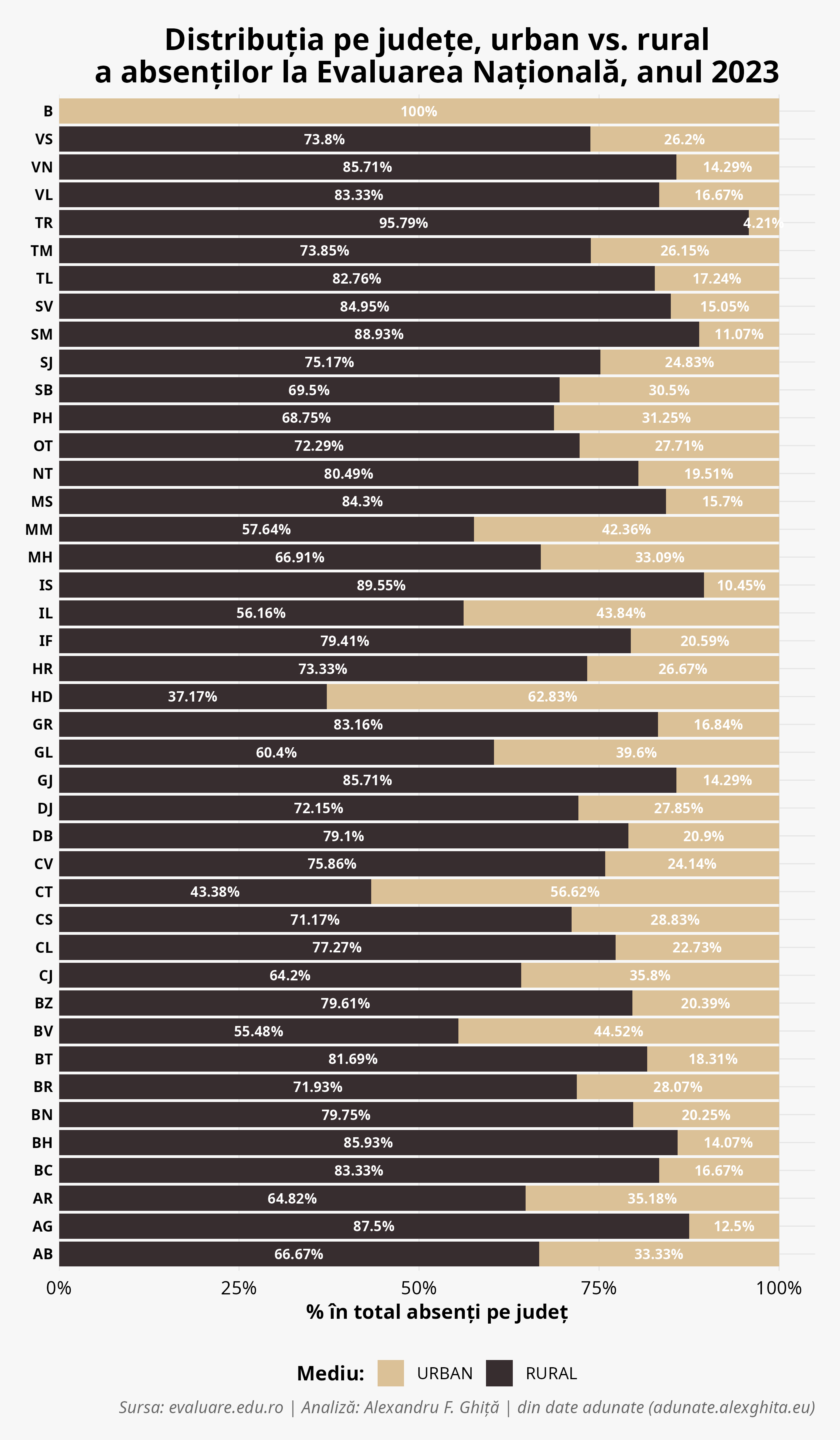 Din totalul absenților, aproape trei sferturi vin din rural. Cu alte cuvinte, 7 din 10 copii provin din comune și sate. În județe precum Argeș sau Bacău, peste 80% dintre absenți sunt de la țară, iar Teleormanul ține steagul sus cu un fabulos 95,8% absenți din rural. Satu Mare, la rândul său, are 89% din absenteism tot din comune. În schimb, în locuri mai urbanizate, lucrurile sunt mai echilibrate. Constanța, de exemplu, are 56,6% absenteism din mediul urban – o raritate – iar Hunedoara e chiar atipică, cu aporoape de două ori mai mulți absenți din urban decât din rural (62,8%).
