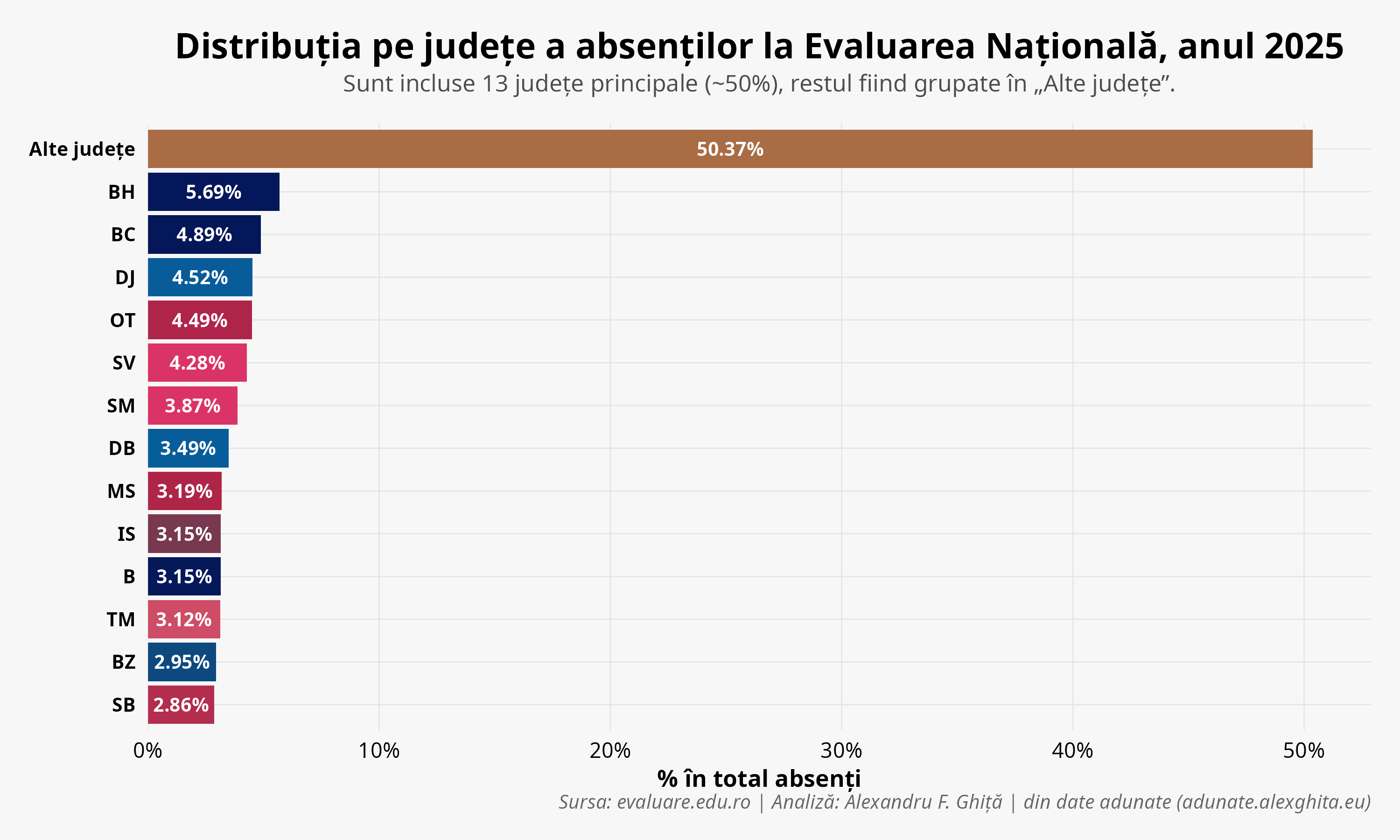Dacă ne uităm la distribuția absenților la Evaluarea Națională între județe, apare un detaliu important: jumătate dintre elevii care au lipsit provin din 13 județe. Și ca să punem lucrurile în perspectivă, România are 41 de județe plus Bucureștiul – deci, practic, 13 din 42 de unități administrative adună împreună 50% din toți absenții. Asta înseamnă că absenteismul nu e împrăștiat uniform prin țară, ci se concentrează în anumite zone. Bihorul deschide topul, cu aproape 5,7% din totalul național al absenților, urmat de Bacău, Dolj și Olt, fiecare sărind de 4%. Chiar și județe mari și urbane, cum sunt Bucureștiul sau Iașiul, apar în top, deși cu procente mai modeste, pe la 3% fiecare. Pe scurt, o treime din țară „produce” jumătate din absenteism, aproape 3.500 de absenți, ceea ce spune multe despre unde ar trebui analizate problemele de bază: sărăcie, lipsă de infrastructură școlară și/sau resurse sau migrație masivă.