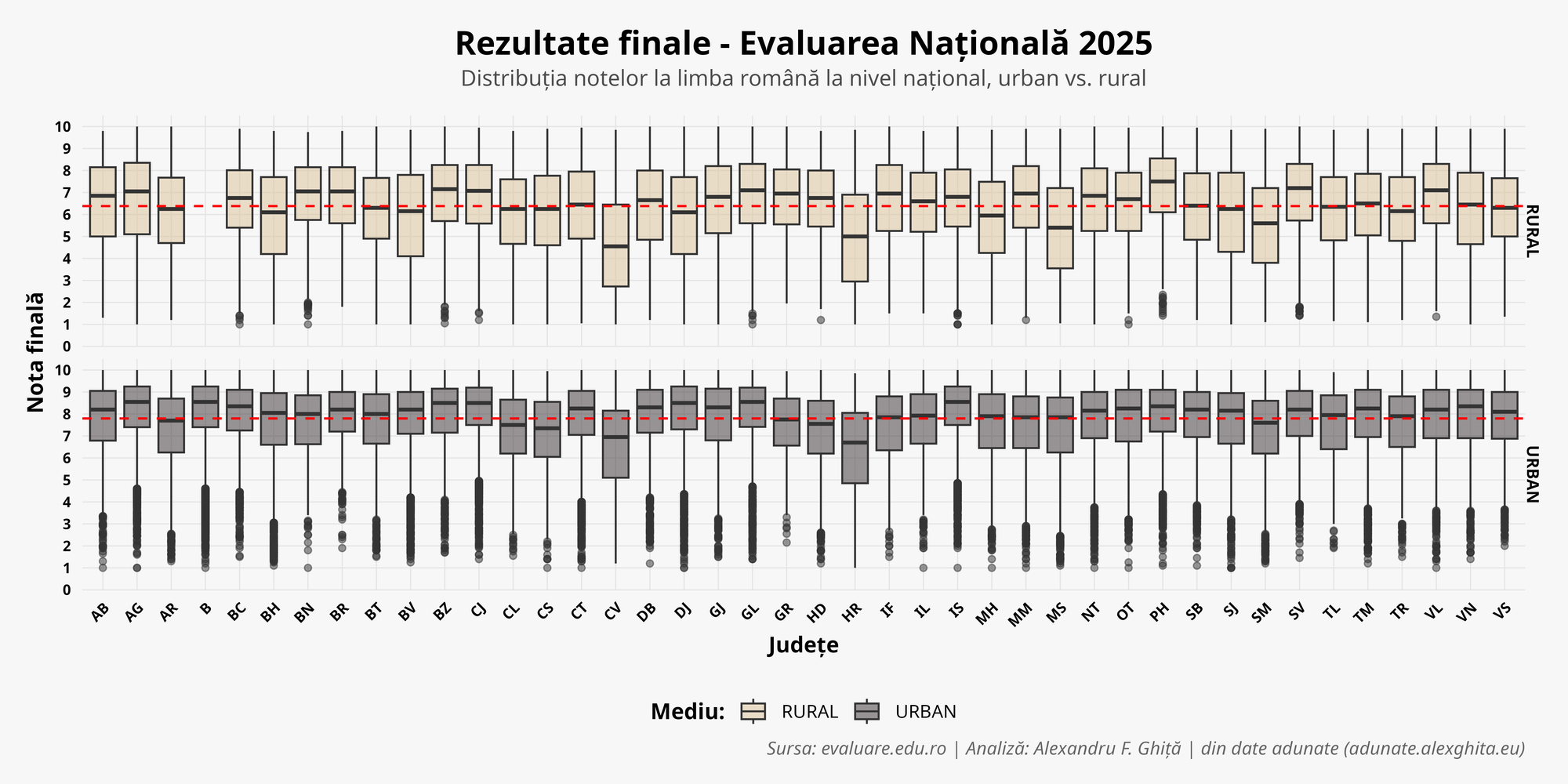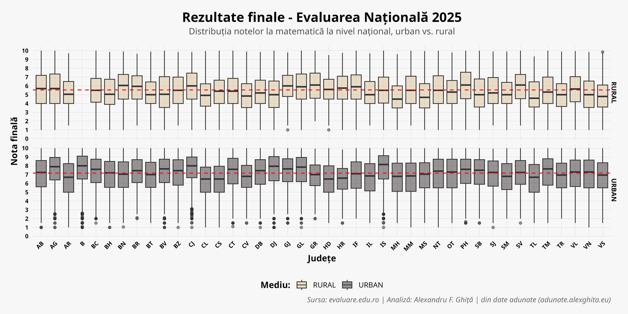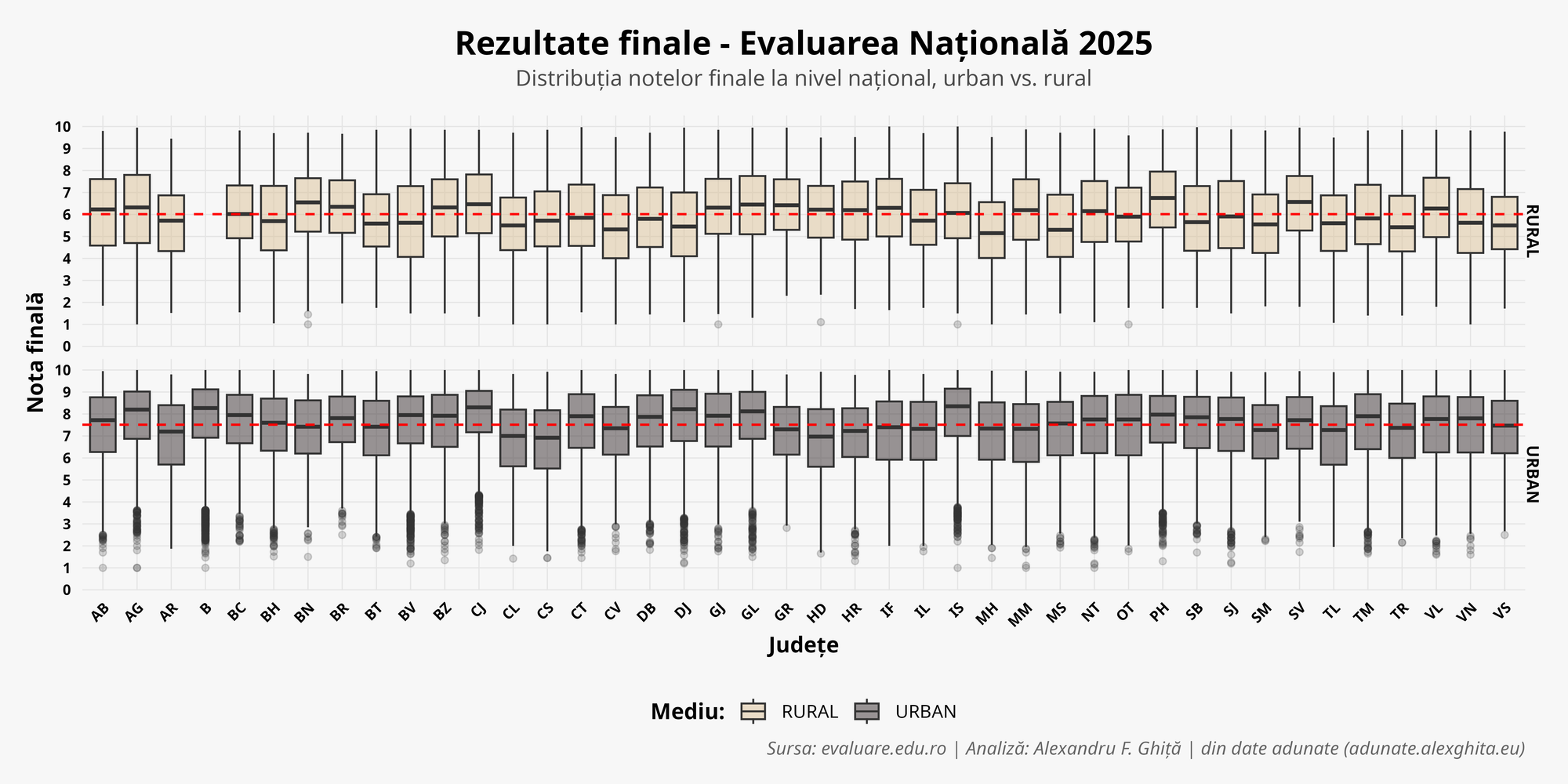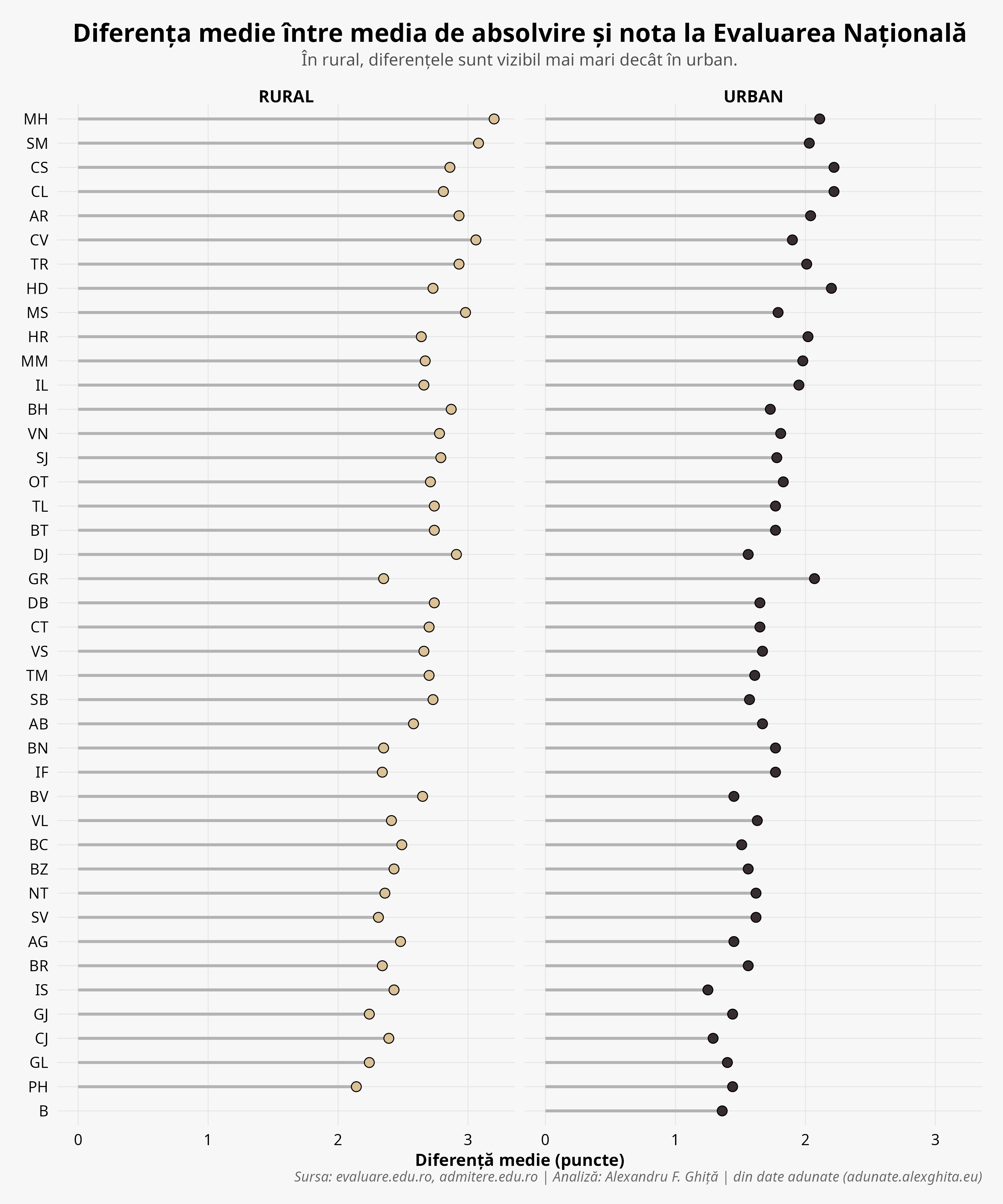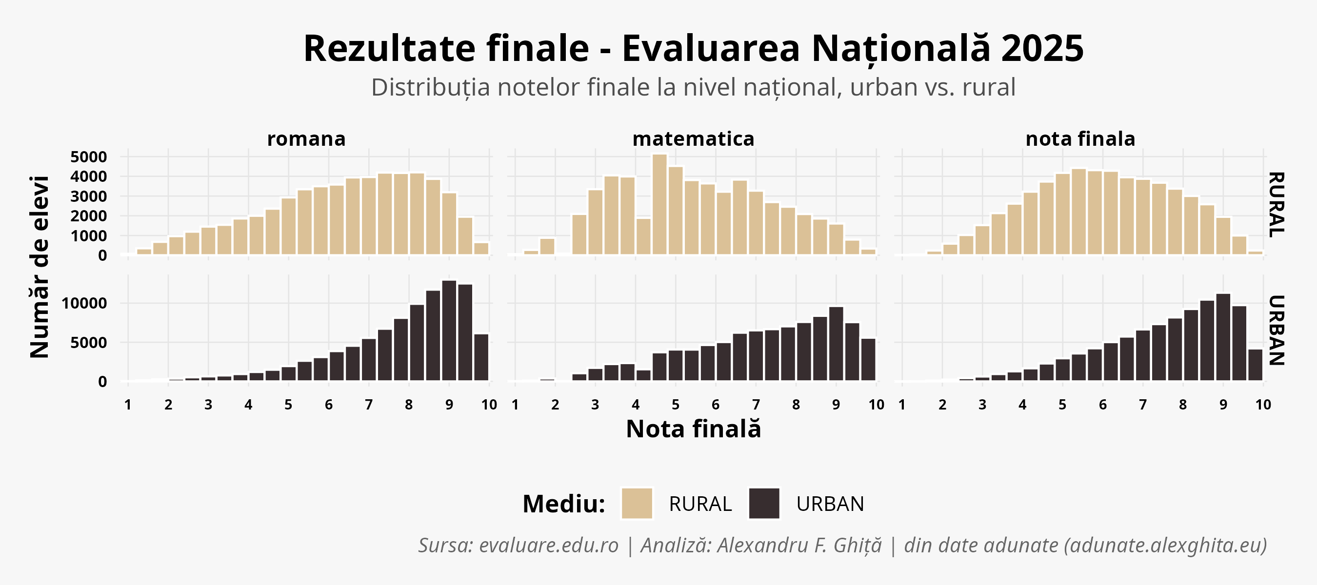 Ce se vede clar e că urbanul trage în sus media națională și livrează headline-urile cu "zeci de medii de 10", în timp ce ruralul ține partea cealaltă a distribuției, alimentând știrile despre "elevi la limită". Și între ele, se crește gap-ul în fiecare an, apoi noi ne prefacem că vrem să îl micșorăm, dar, statistic vorbind, n-are niciun chef să se micșoreze.