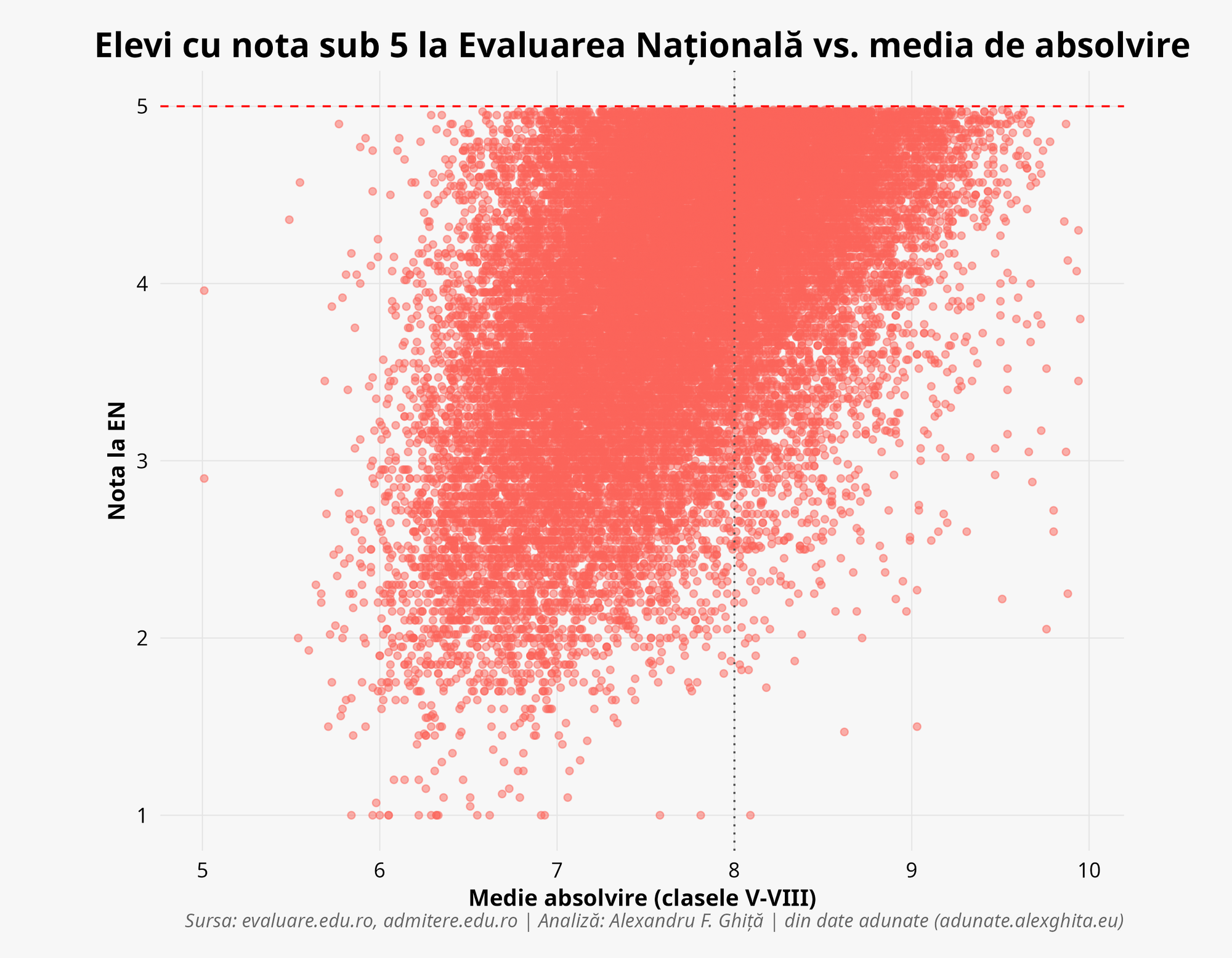 Ce înseamnă asta? Înseamnă că în școală, în catalog, stăteau bine. Unii cu 7, 8, 9, chiar și peste 9, dar la examen s-au dus la mult sub 5. E plin graficul de puncte roșii care se opresc înainte să atingă măcar nota 5. Și nu sunt puțini: mii de elevi în toată țara. Asta arată clar că mediile din școală și realitatea Evaluării Naționale sunt în galaxii diferite.
