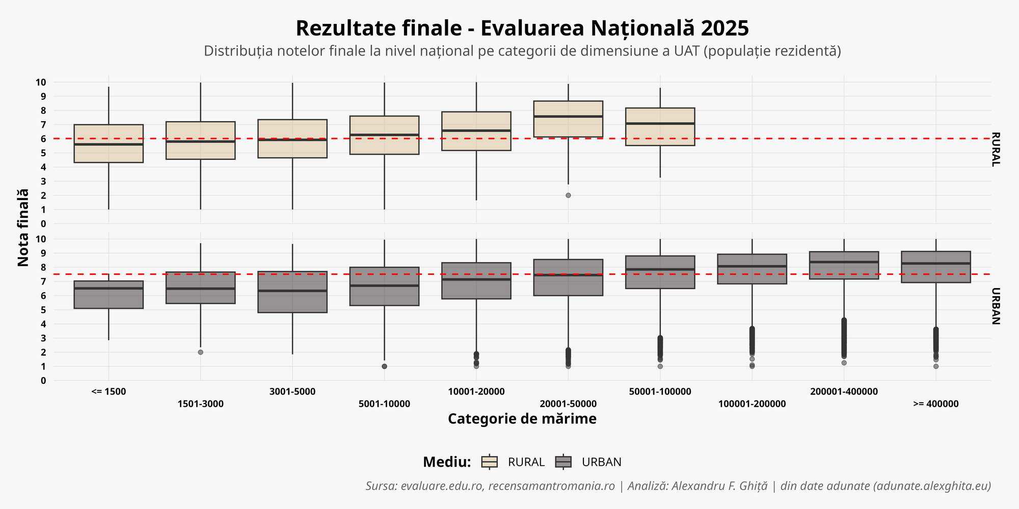Bun, să intrăm și mai adânc în cifrele EN. Ce ne spune distribuția notelor finale în funcție de mărimea localității (UAT)? Cu cât locuiești într-o localitate mai mare, cu atât ai șanse mai bune să iei note mari.