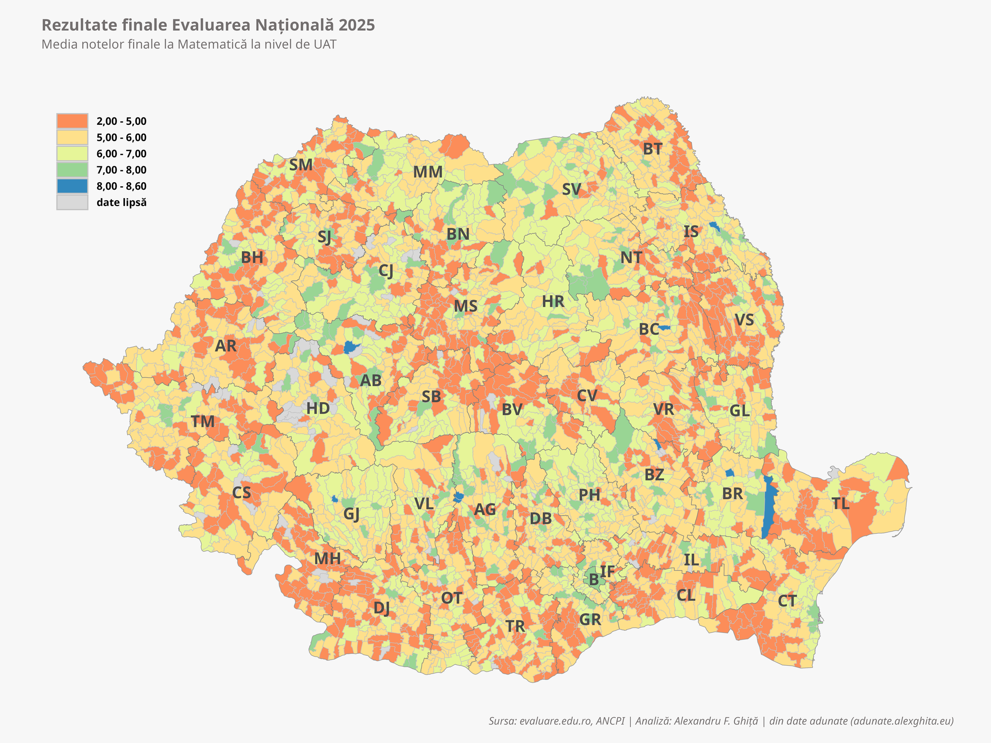 Repet ce am subliniat mai sus, e important să nu uităm un lucru: în multe comune mici, o singură notă foarte mică poate să urce instant procentul de sub 5. Dacă ai, să zicem, 5 elevi și unul ia 3, deja localitatea sare în altă categorie de culoare. Deci harta e corectă statistic, dar trebuie privită cu puțină nuanță.