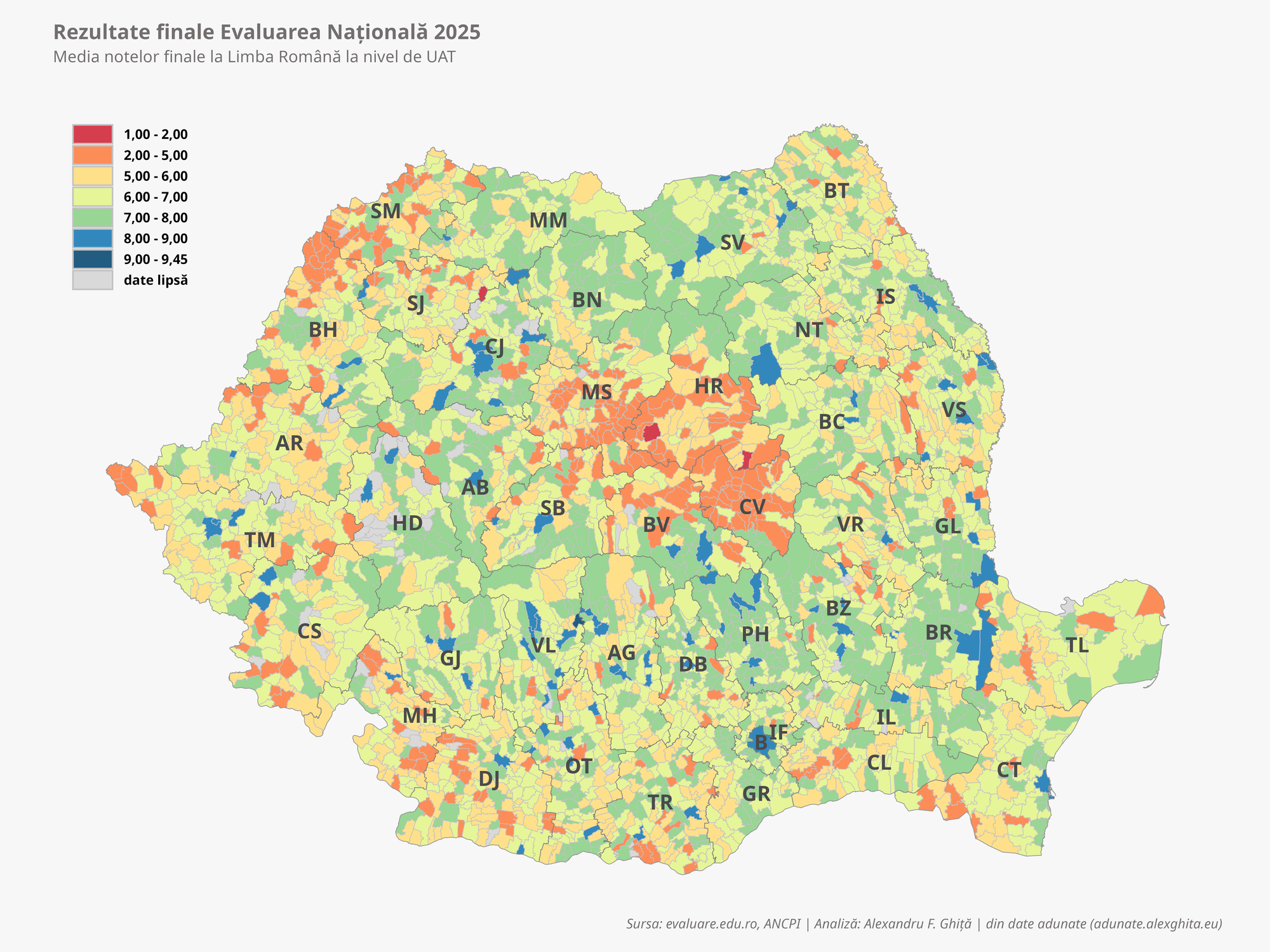 Dacă ne uităm la distribuția în teritoriu a rezultatelor la proba de Limba Română, vedem că aceasta nu sună la fel în toată țara. Zonele albastre și verzi (note mari) se concentrează în jurul marilor orașe și în câteva insule surpriză, în timp ce roșul și portocaliul bântuie multe zone rurale.