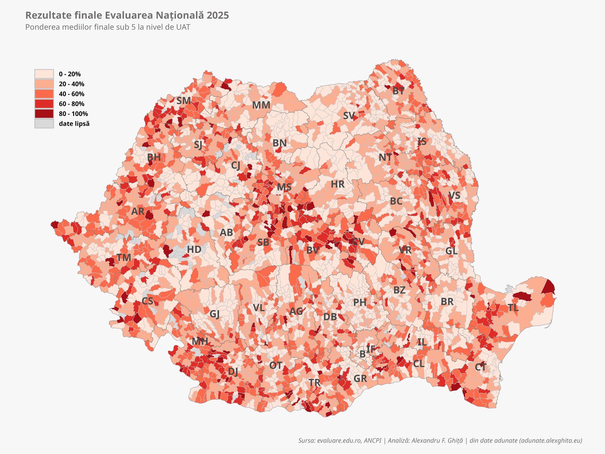 Procentul de sub 5 e cea mai dură radiografie a sistemului. Poate vorbim despre medii de 10 la televizor, dar ~60% dintre localitățile României au între 20 și 100% dintre elevi sub nota 5. Și, chiar dacă în unele locuri e vina statisticii (puțini elevi, o singură notă mică), tabloul general arată o problemă serioasă: România are mii de copii care nu ies în poză și despre care nu vorbește nimeni.