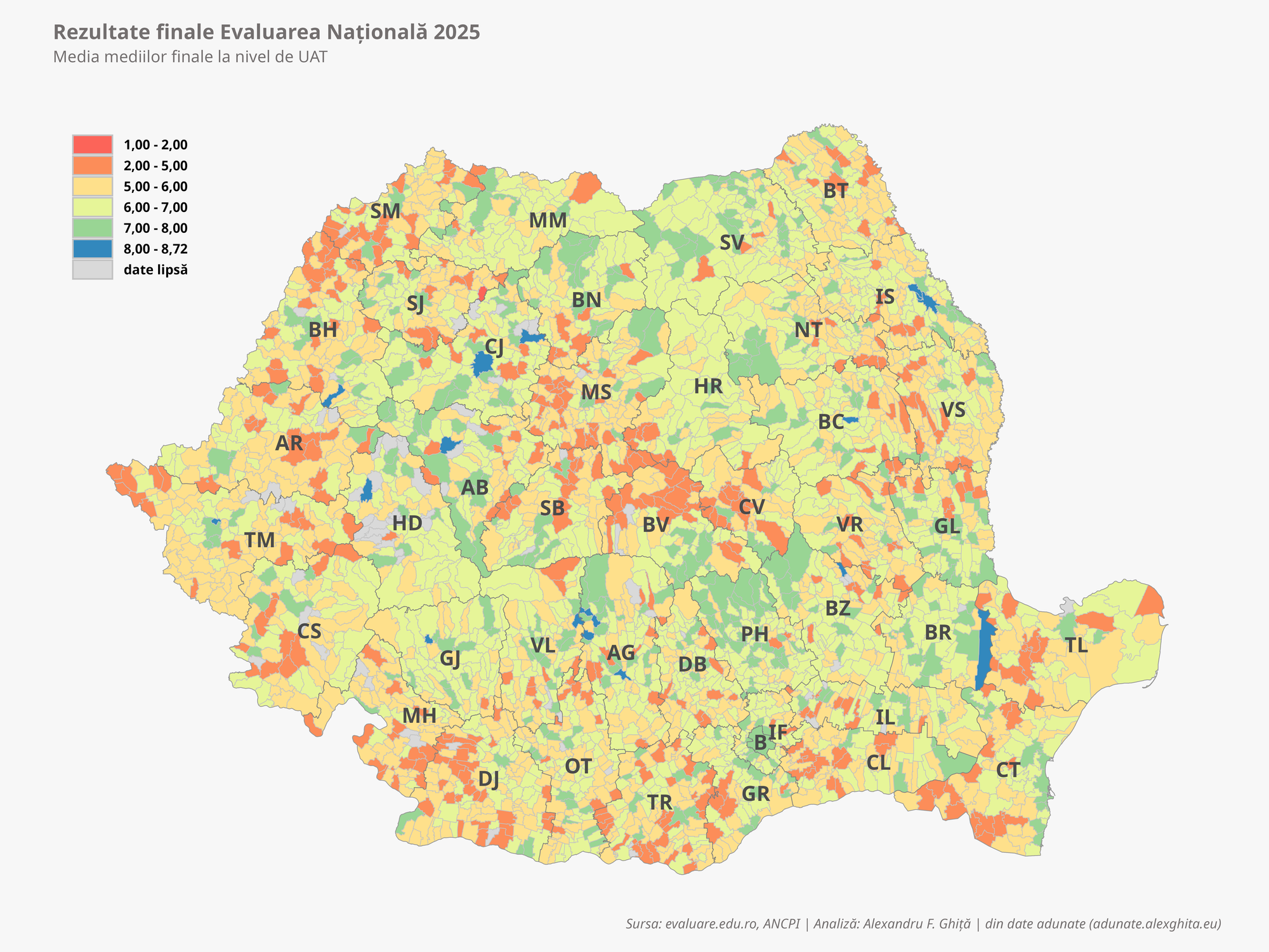 Hărțile Evaluării Naționale seamănă perfect cu hărțile economiei. Localitățile cu medii mari la EN sunt fix acolo unde sunt și indicatorii economici mai buni: orașele mari, zonele mai dezvoltate, Cluj, București, Iași. În schimb, roșul și portocaliul domină hărțile în sud, în Moldova și în multe zone rurale. Da, uneori, o singură notă de 1,5 într-un sat mic trage toată media localității în jos — deci datele trebuie citite cu atenție și nuanță, dar asta nu ne absolvă de problemă.